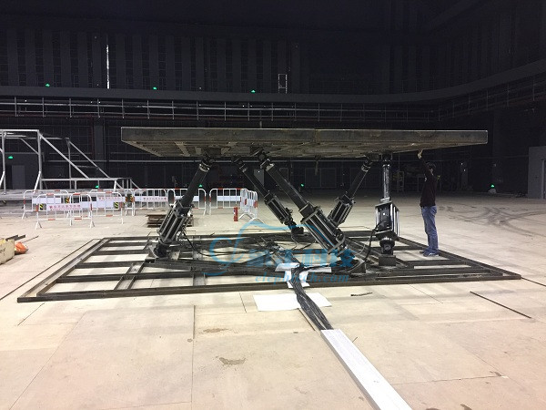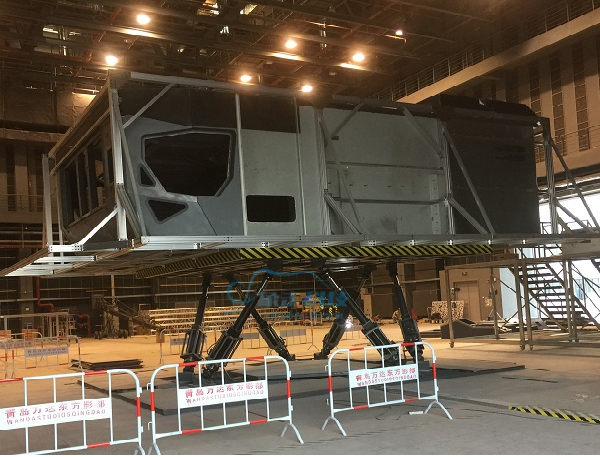 该模拟器有效负载为6000kg,台面尺寸为8000mm*6000mm,舱体为铝合金及玻璃钢材质,该平台可由游戏手柄手动控制或者随3D视景自动运行。