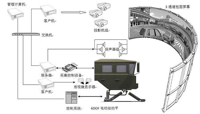 模拟器驾驶舱主体采用钢骨架、玻璃钢蒙皮或金属蒙皮的结构,外壳采用汽车喷涂工艺,美观、大方。驾驶舱内安装有仪表台、方向盘、各类踏板、司机座椅、排档杆、安全带、手制动器等与驾驶操作有关的各类设备,内部布局尽量与原型车一致。驾驶舱安装一个六自由度电动运动平台上,可进行六自由度体感仿真,提供各向加速度、各类振动、侧倾、俯仰、冲动等体感效果。模拟器配备前向三通道大屏幕柱面视景系统、三通道实体后视镜视景系统。车体内饰的适当位置隐藏安装有5.1声道的音响系统。其硬件基本构成如下图所示。